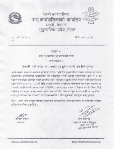 » ऐलानी पर्ती जग्गा नाप नक्सा सुरु हुने सम्बन्धि १५ दिने सूचना ।