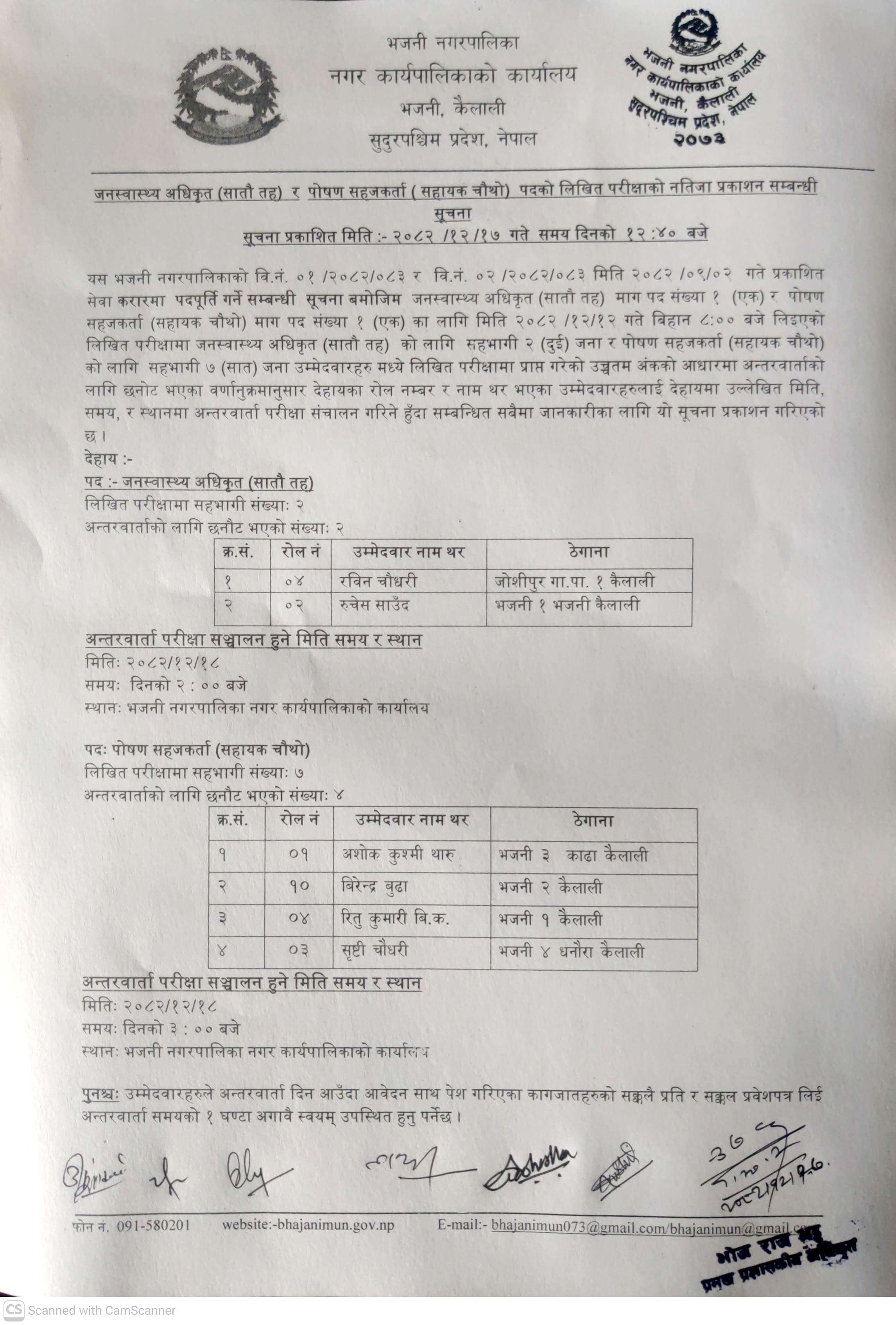 जनस्वास्थ्य अधिकृत (सातौ तह) र पोषण सहजकर्ता (सहायक चौथो) पदको लिखित परीक्षाको नतिजा प्रकाशन सम्बन्धी सूचना ।