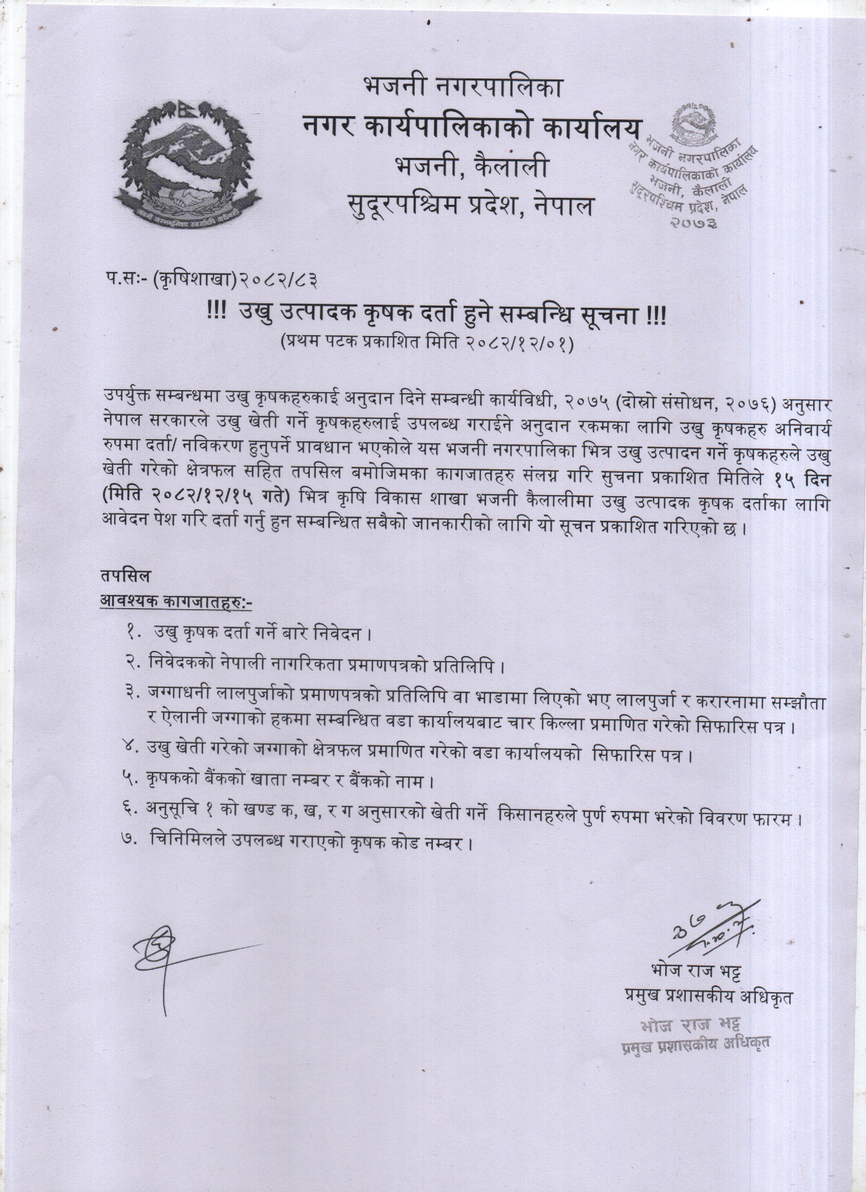 » उखु उत्पादक कृषक दर्ता हुने सम्बन्धि सूचना ।
