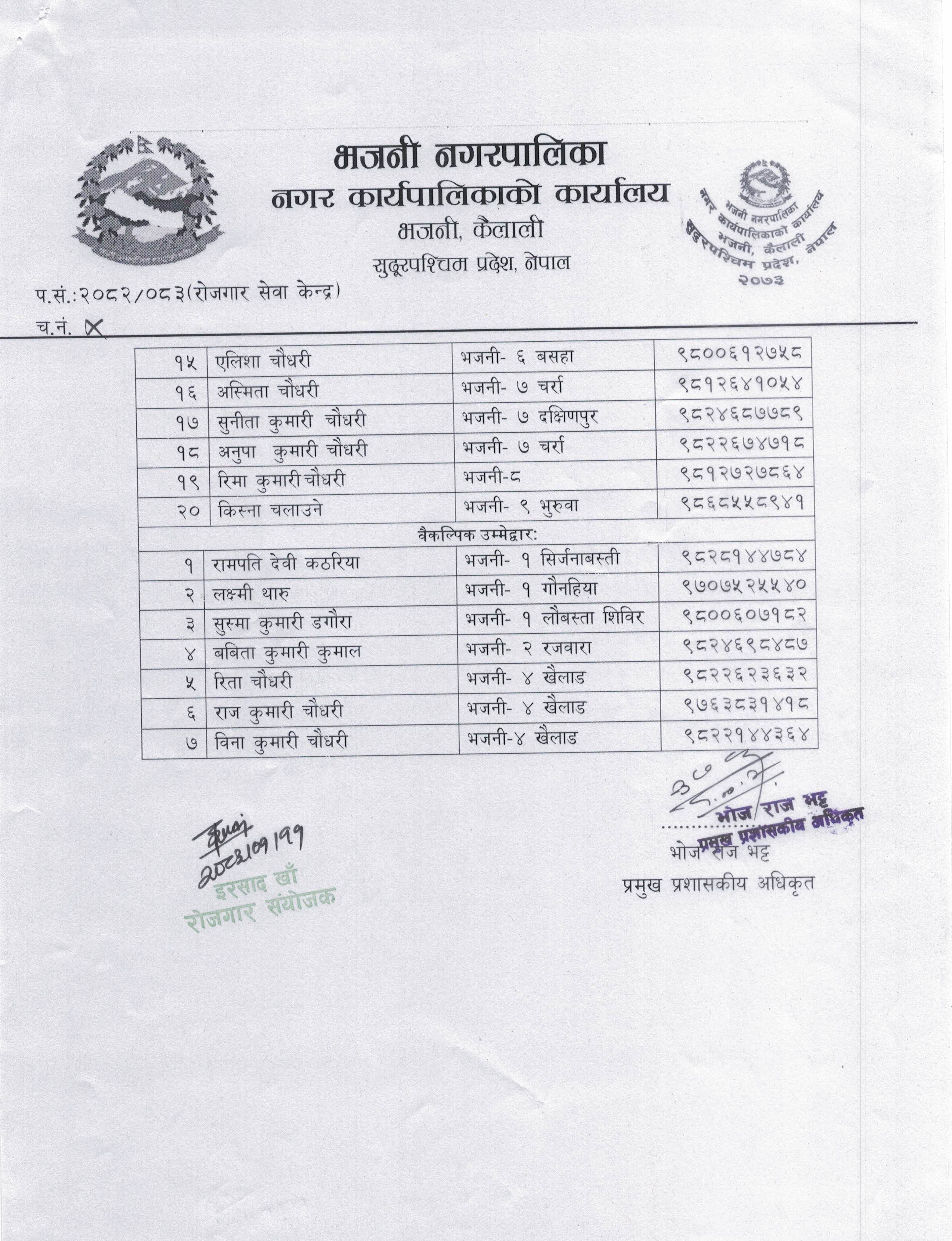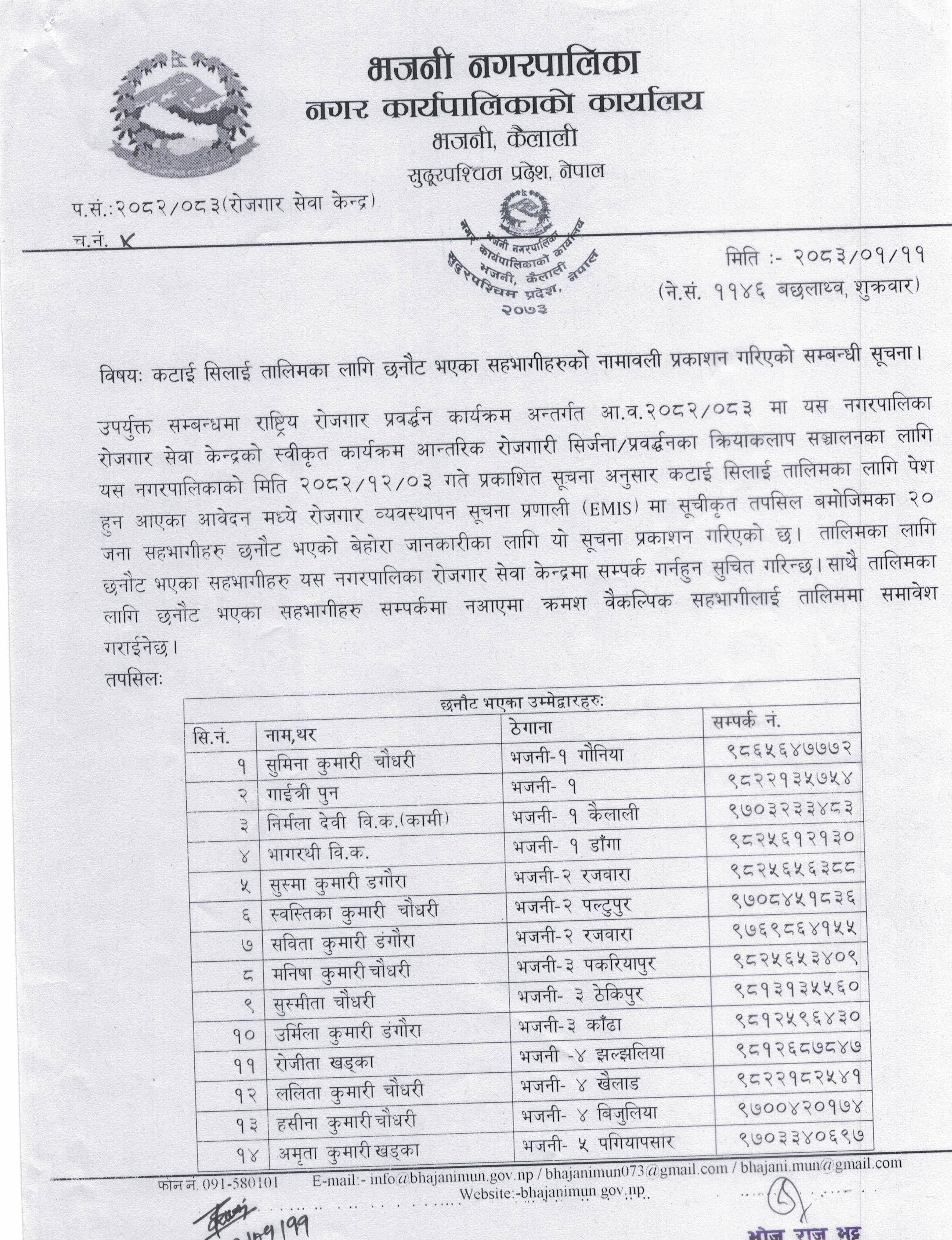 कटाई सिलाई तालिका लागि छनौट भएका सहभागीहरुको नामावली प्रकाशन गरिएको सम्बन्धी सूचना ।