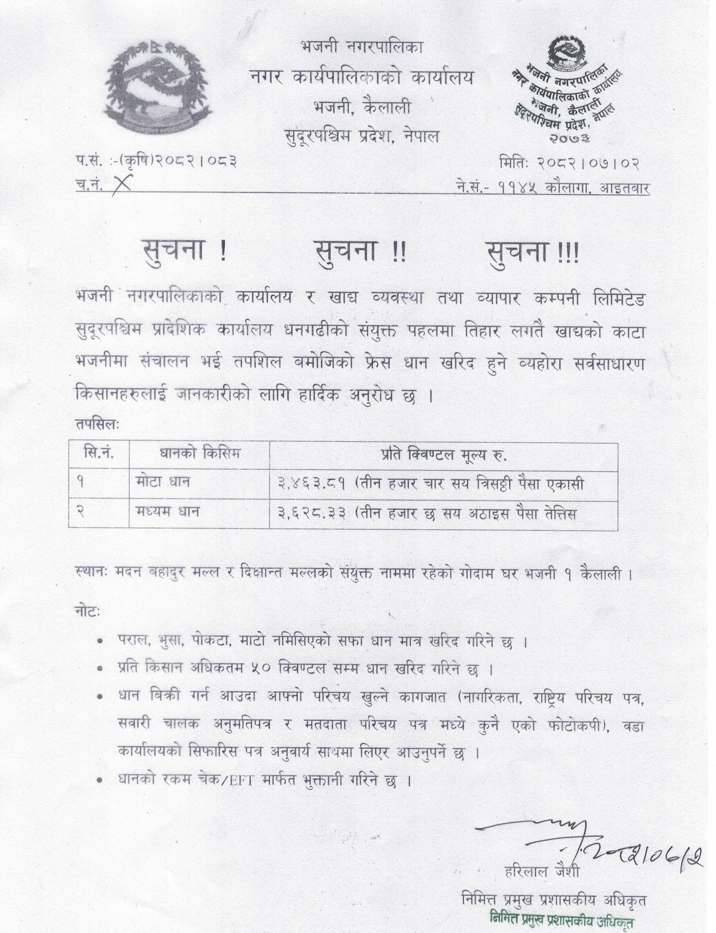 जिल्ला प्रशासन कार्यालय धनगढी, कैलालीको न्यूनतम समर्थन मुल्य निर्धारण सम्बन्धमा ।