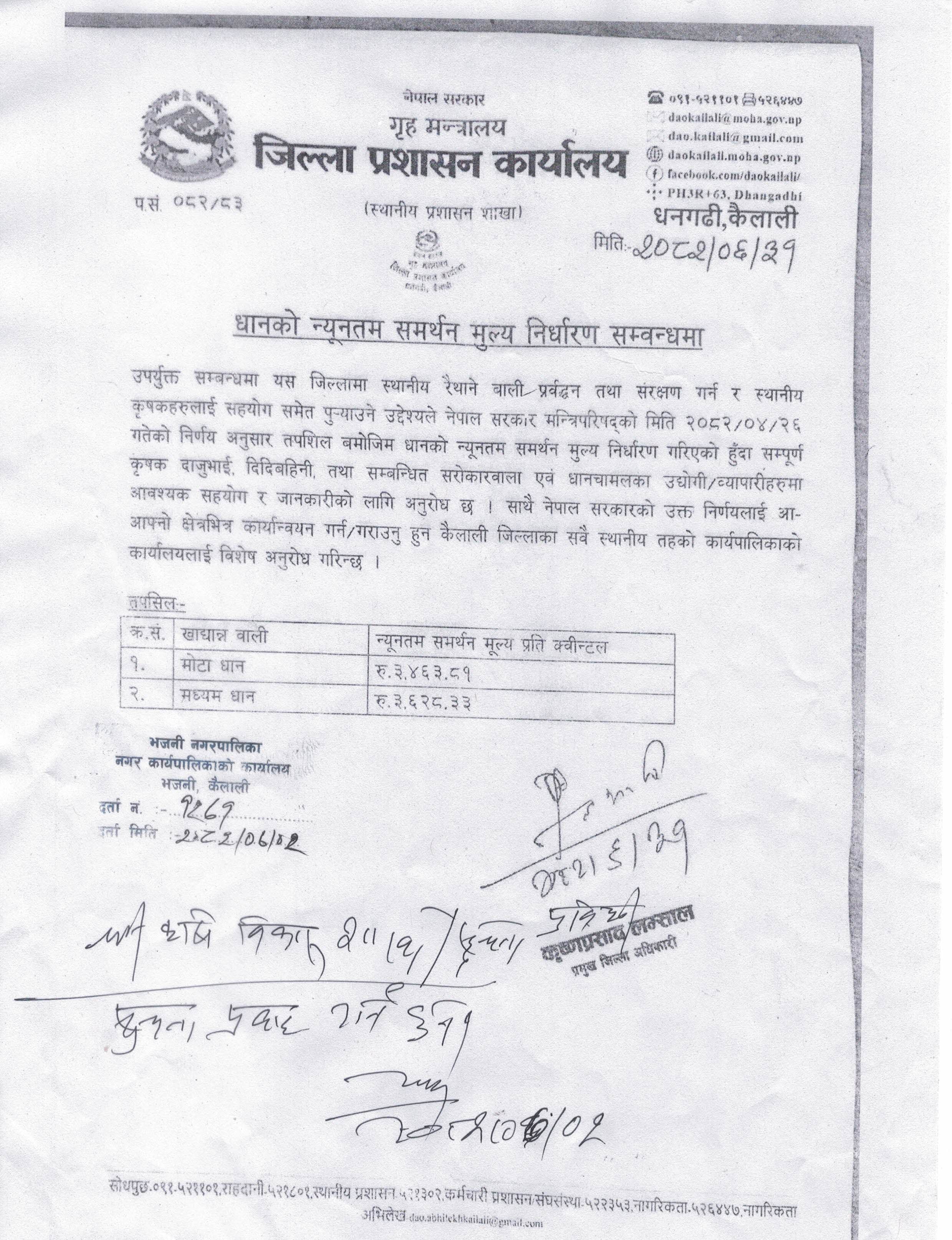 » जिल्ला प्रशासन कार्यालय धनगढी, कैलालीको न्यूनतम समर्थन मुल्य निर्धारण सम्बन्धमा ।