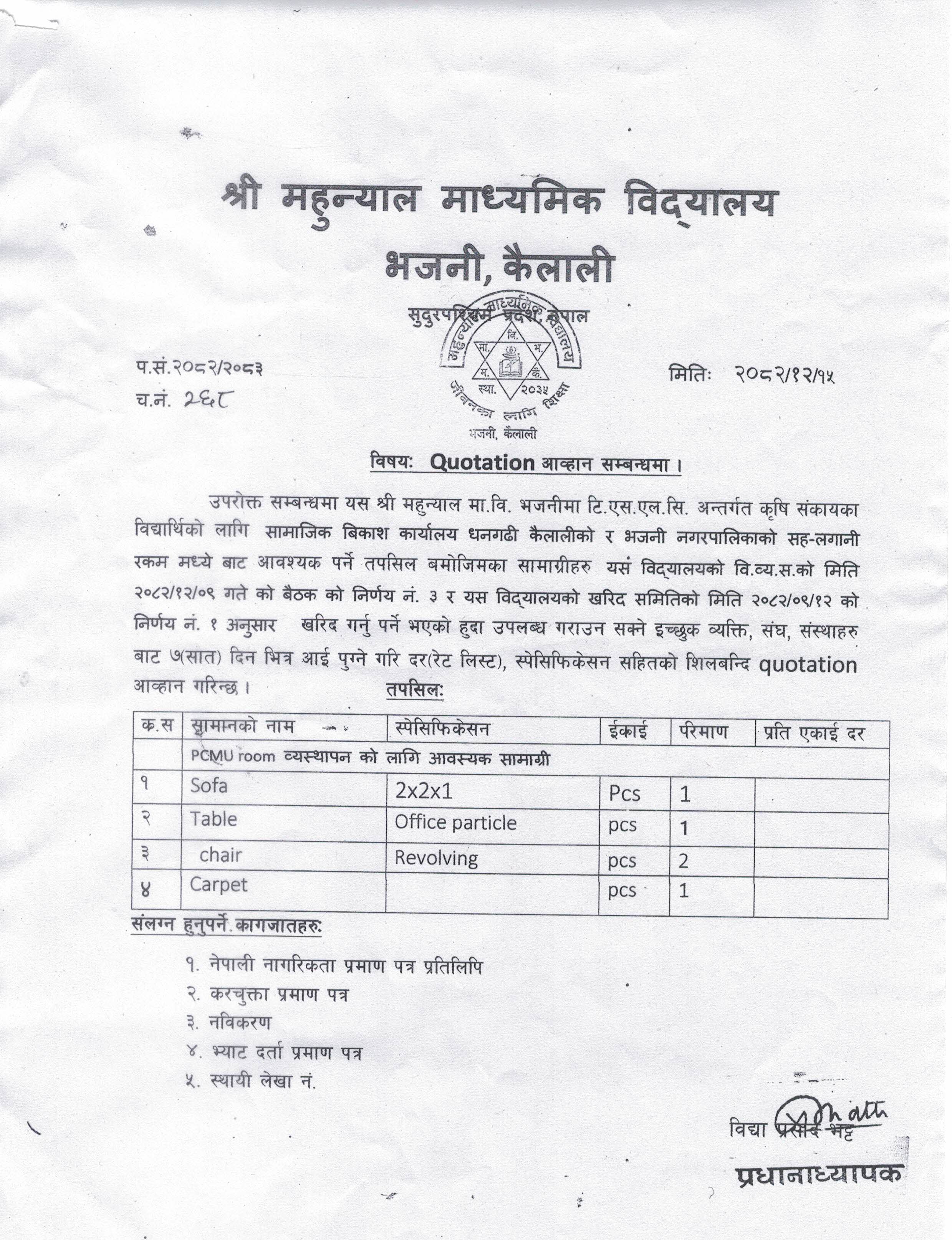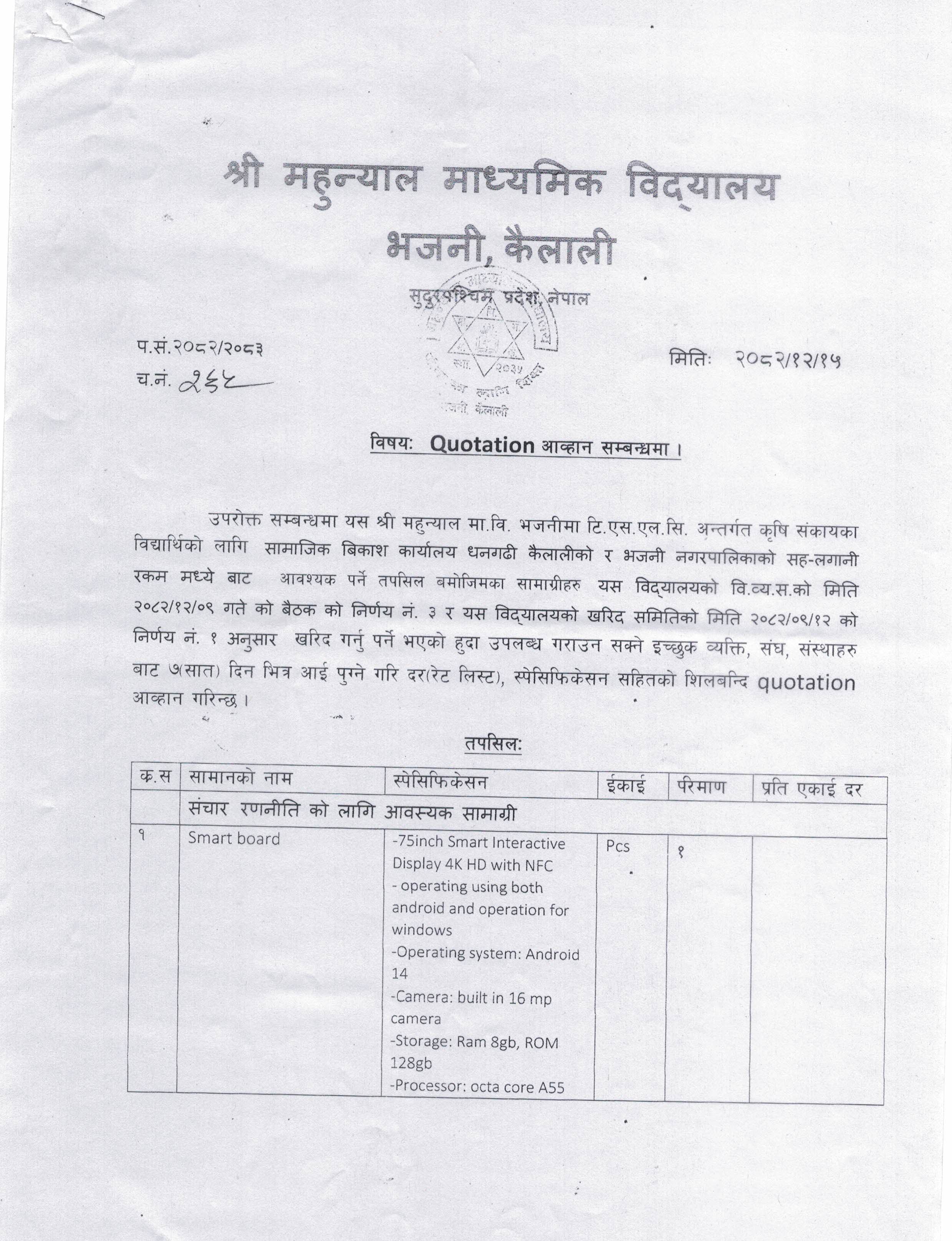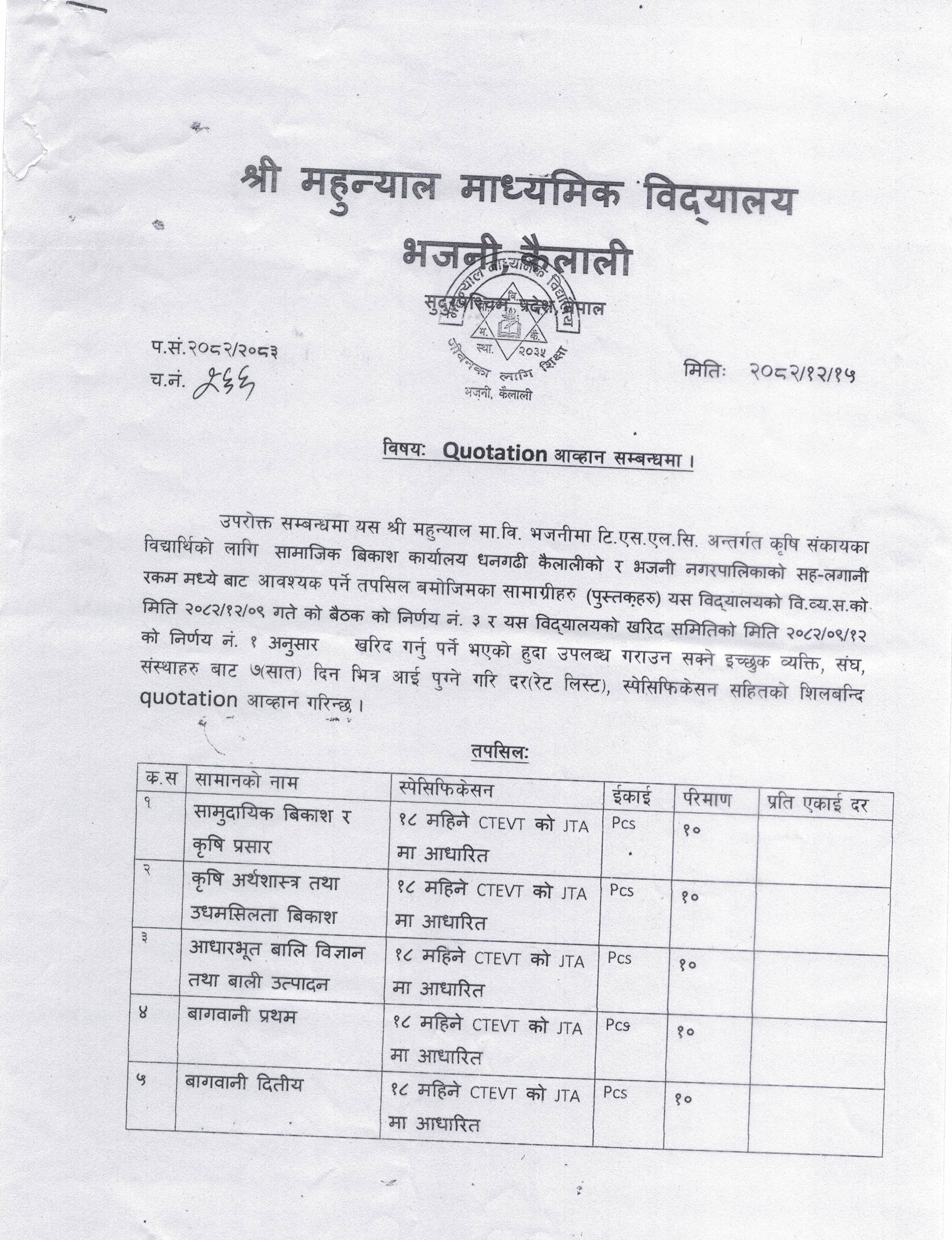 श्री महुन्यान मा.वि. भजनी, कैलालीको विभिन्न सामानहरुको Quotation आव्हान सम्बन्धमा ।