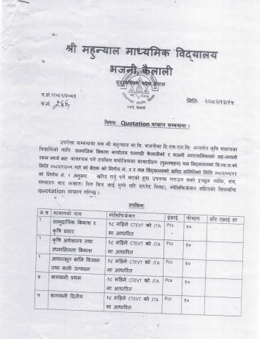 » श्री महुन्यान मा.वि. भजनी, कैलालीको विभिन्न सामानहरुको Quotation आव्हान सम्बन्धमा ।