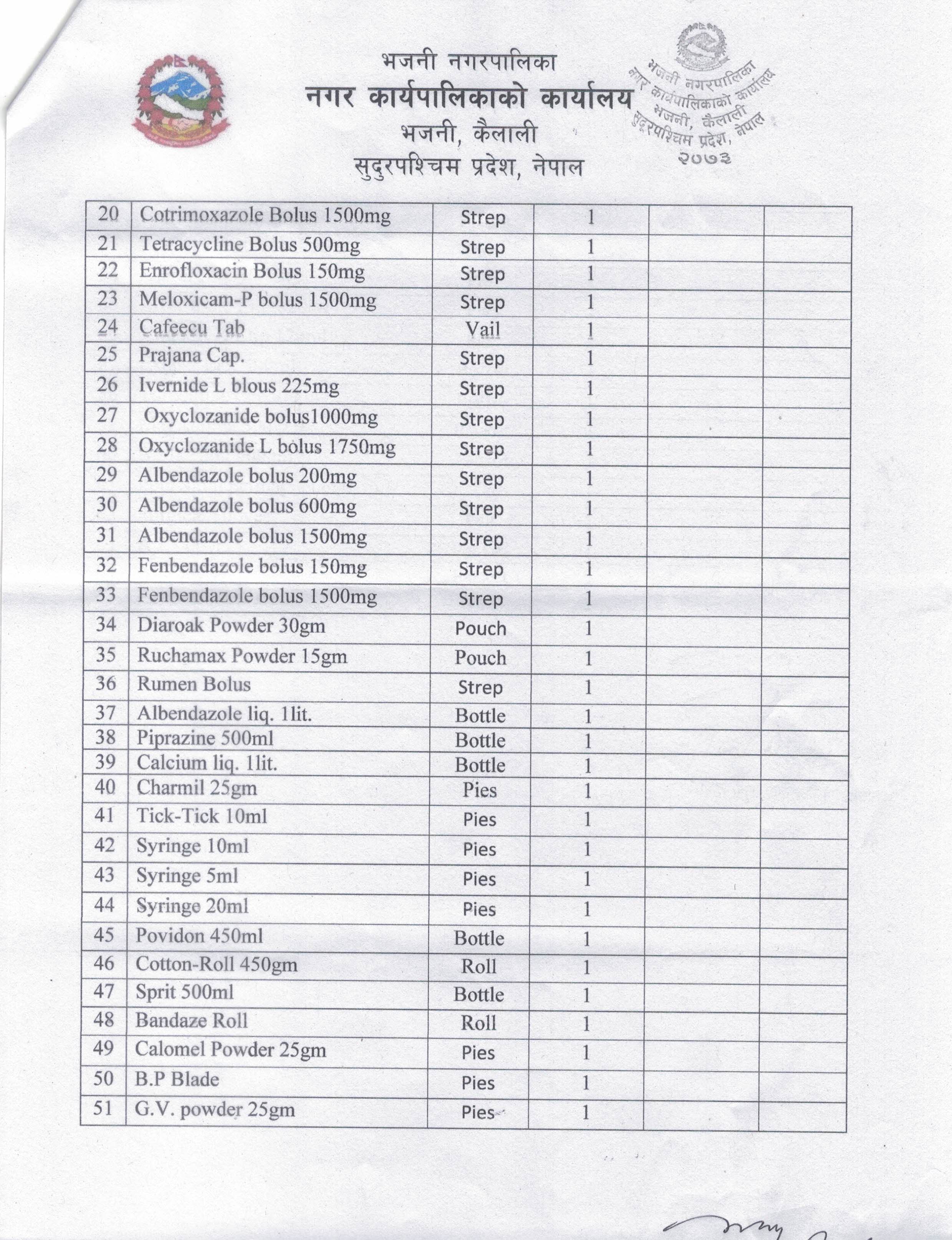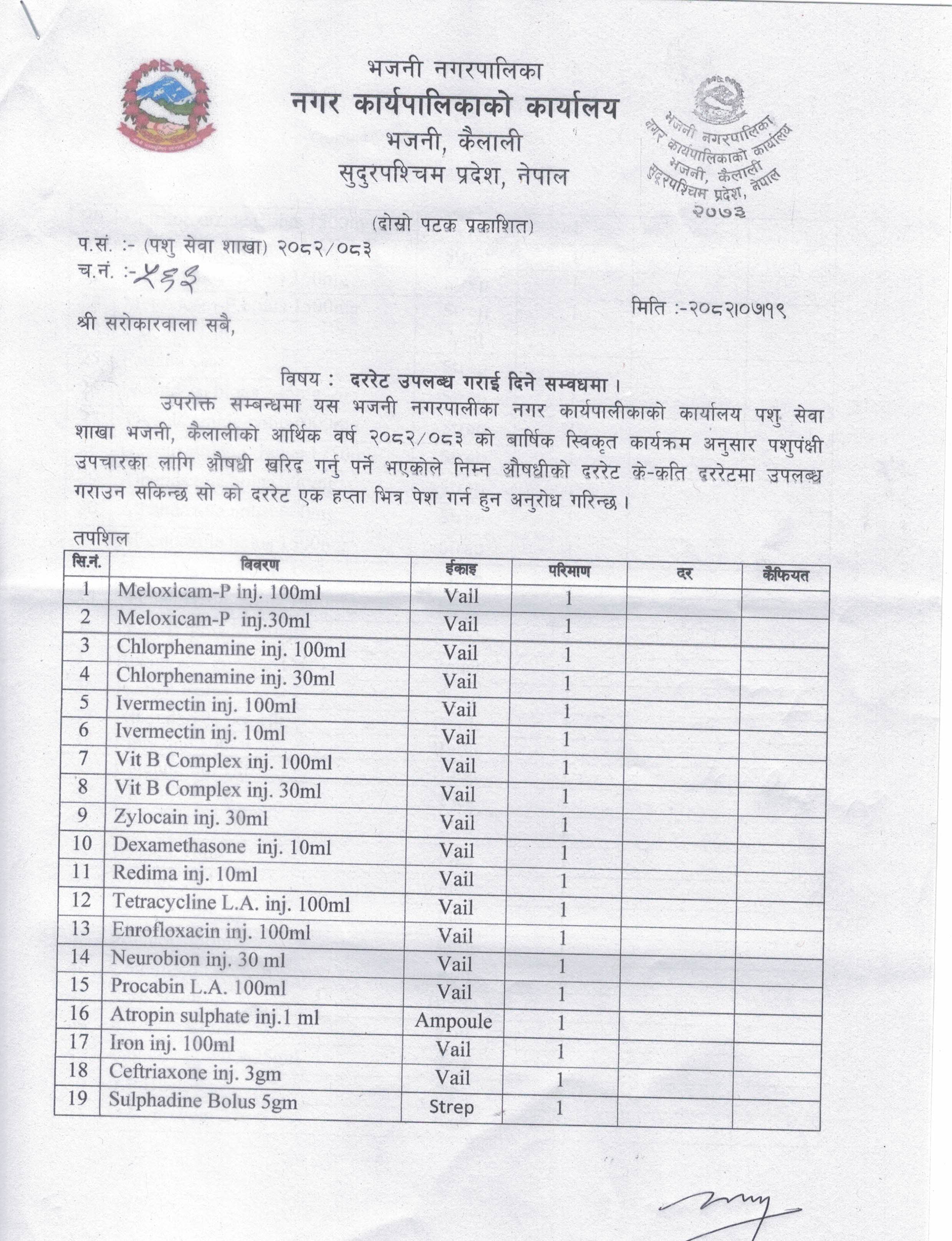 पशु सेवा शाखाका लागि औषधीको दररेट उपलब्ध गराई दिने सम्बन्धमा ।