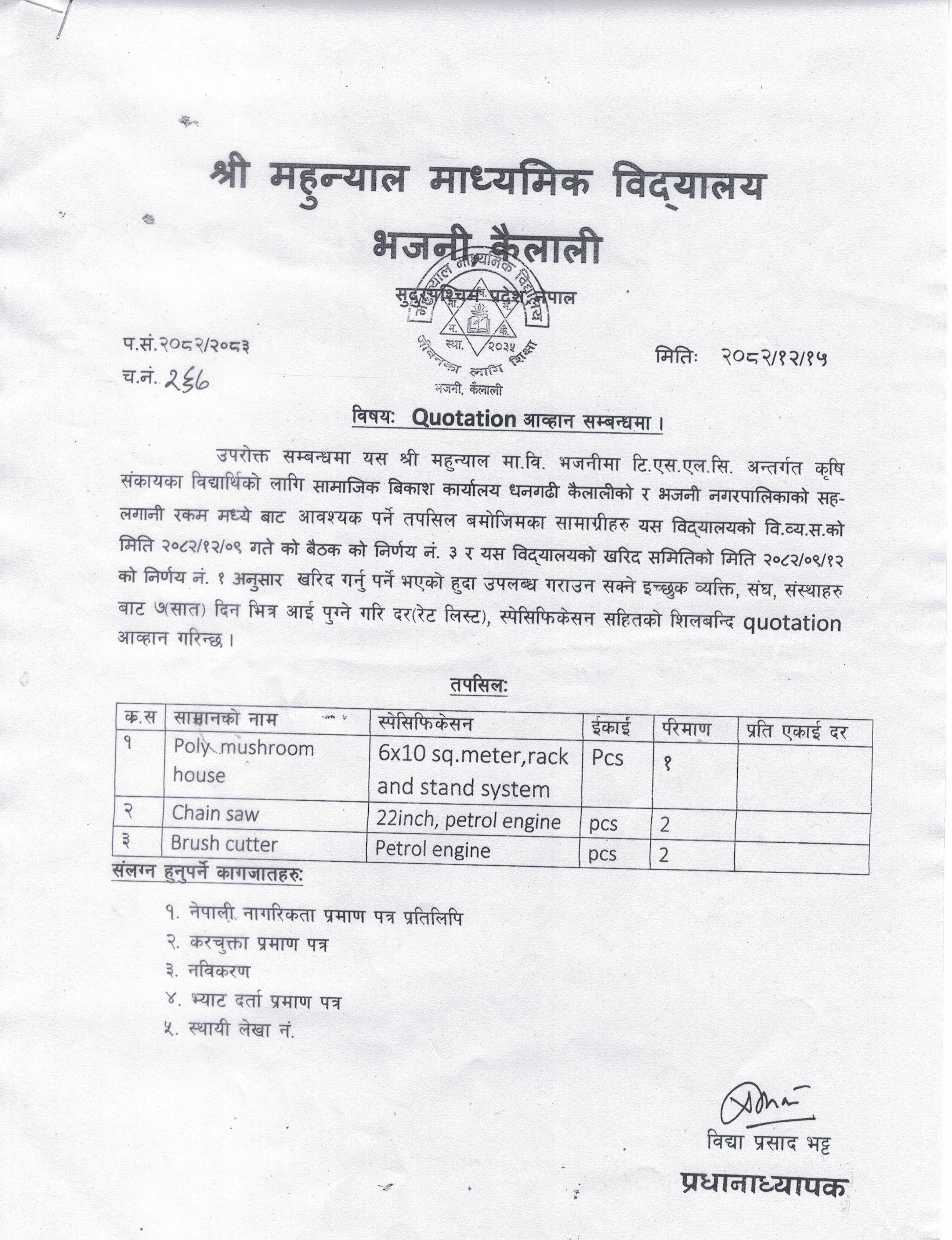 श्री महुन्यान मा.वि. भजनी, कैलालीको विभिन्न सामानहरुको Quotation आव्हान सम्बन्धमा ।