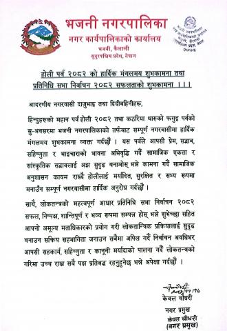 हाेली पर्व २०८२ काे हार्दिक मंगलमय शुभकामना तथा प्रतिनिधि सभा निर्वाचन २०८२ काे सफलताकाे शुभकामना ।