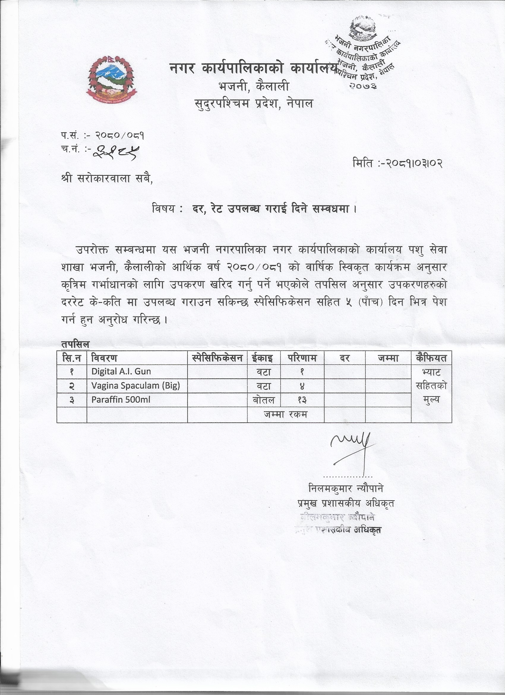 Digital A.I. Gun, Vagina Spaculam (Big) and Paraffin 500ml को दर रेट उपलब्ध गराई दिने सम्बन्धमा ।