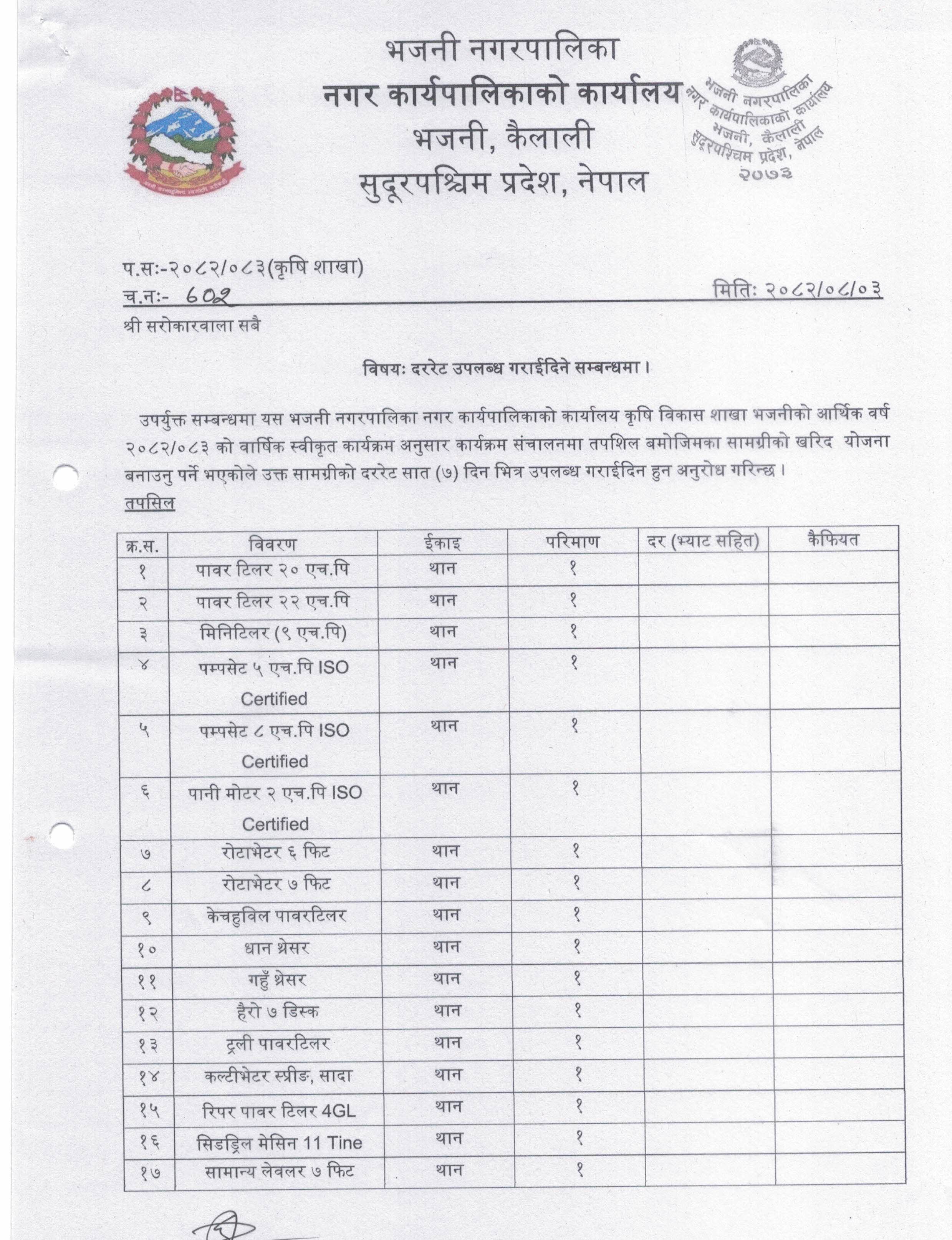 » कृषि यन्त्रीकरण र सिचाई सामाग्रीको दररेट उपलब्ध गराईदिने सम्बन्धमा ।