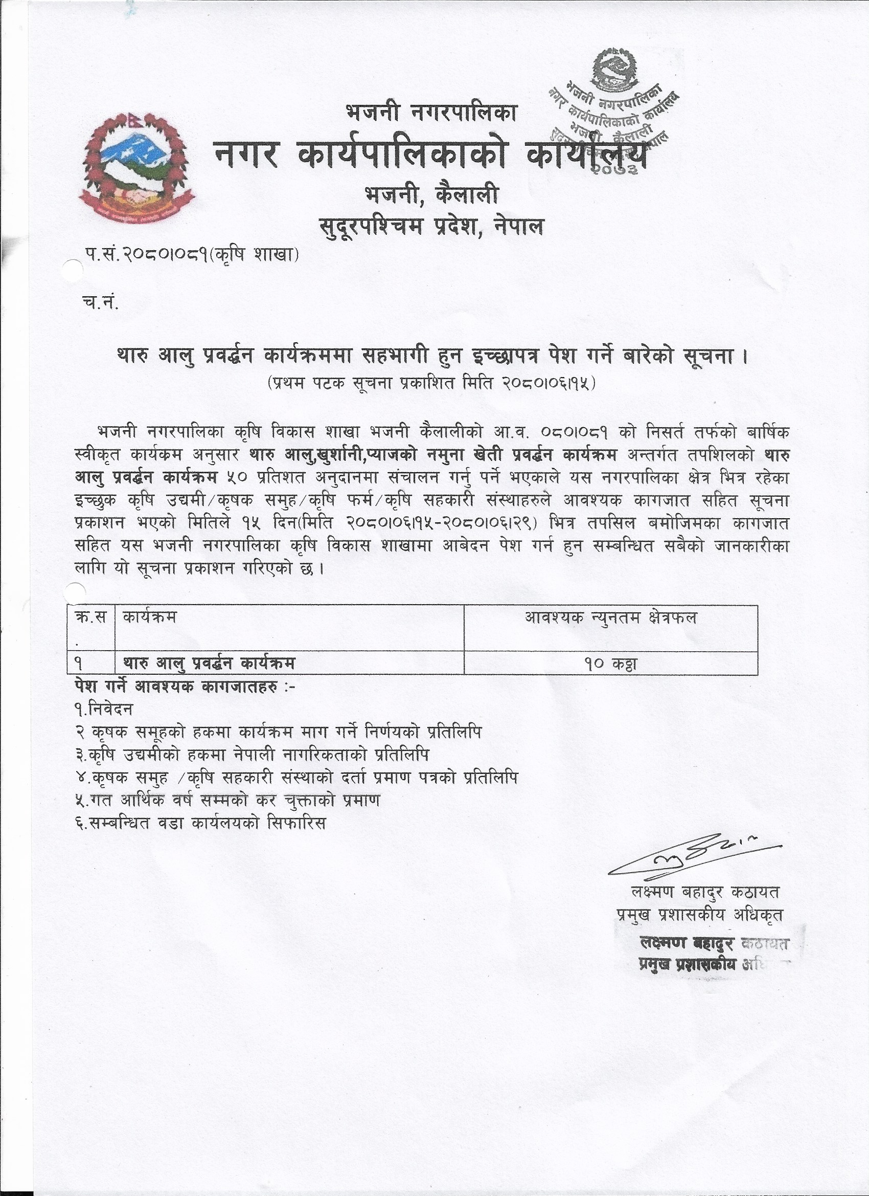 कृषि विकास शाखा अन्तर्गत आ.व. २०८०/०८१ को थारु आलु प्रवर्द्धन कार्यक्रममा सहभागी हुन इच्छापत्र पेश गर्ने बारेको सूचना ।