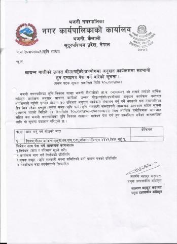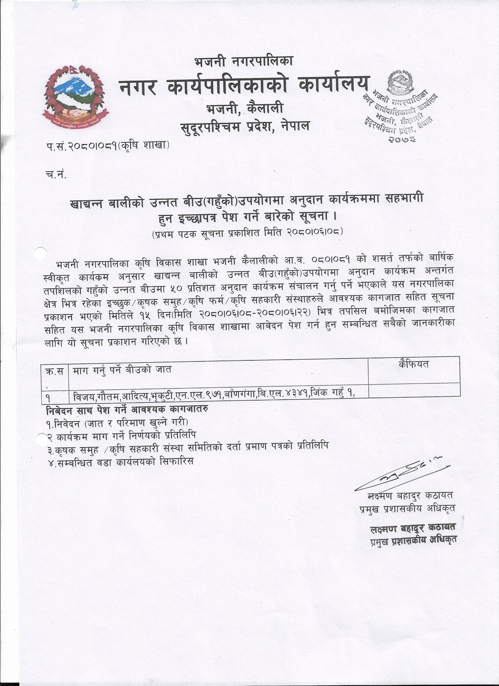 खाद्यन्न बालीको उन्नत बीउ (गहुँको) उपयोगमा अनुदान कार्यक्रममा सहभागी हुन इन्छापत्र पेश गर्ने बारेको सूचना ।