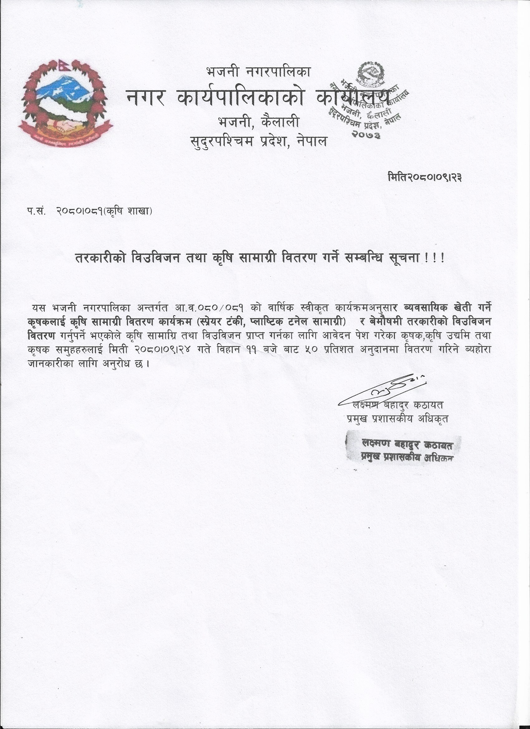 तरकारी विउविजन तथा कृषि सामाग्री वितरण गर्ने सम्बन्धि सूचना ।