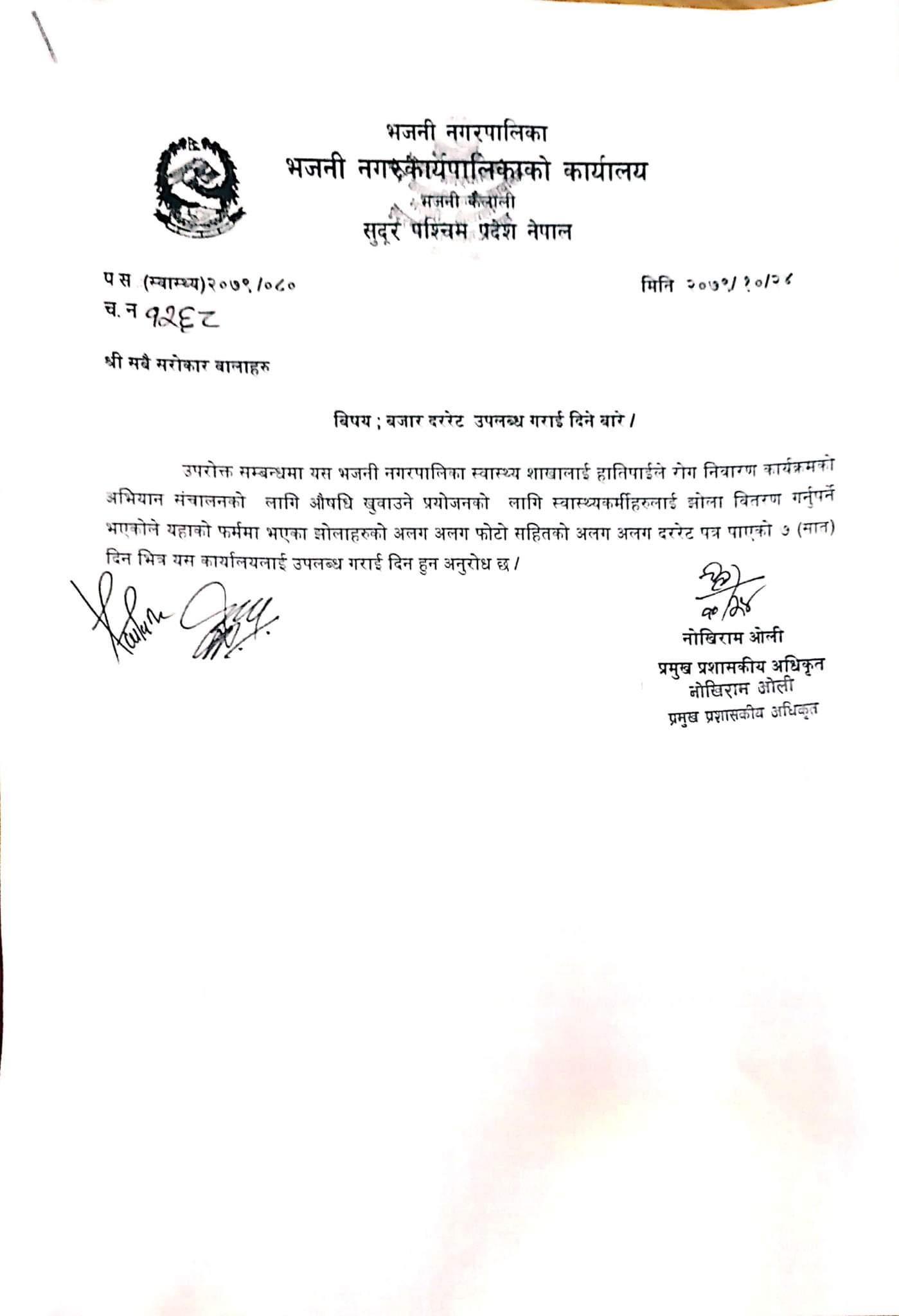 दररेट उपलब्ध गराईदिने सम्बन्धमा (कृषि शाखा) ।