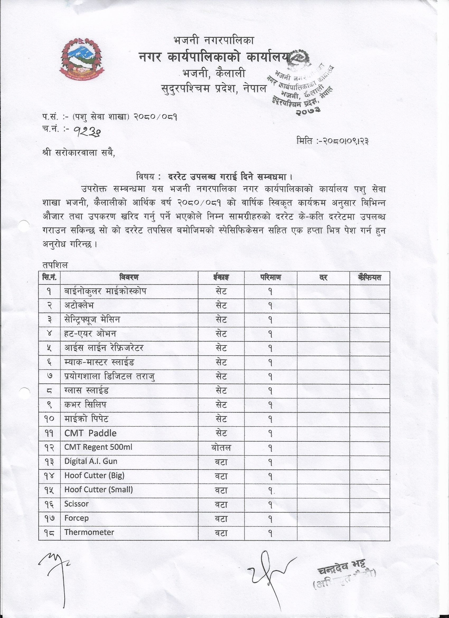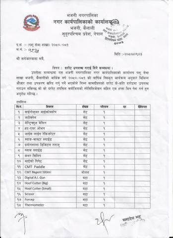 दररेट उपलब्ध गराईदिने सम्बन्धमा (कृषि शाखा) ।