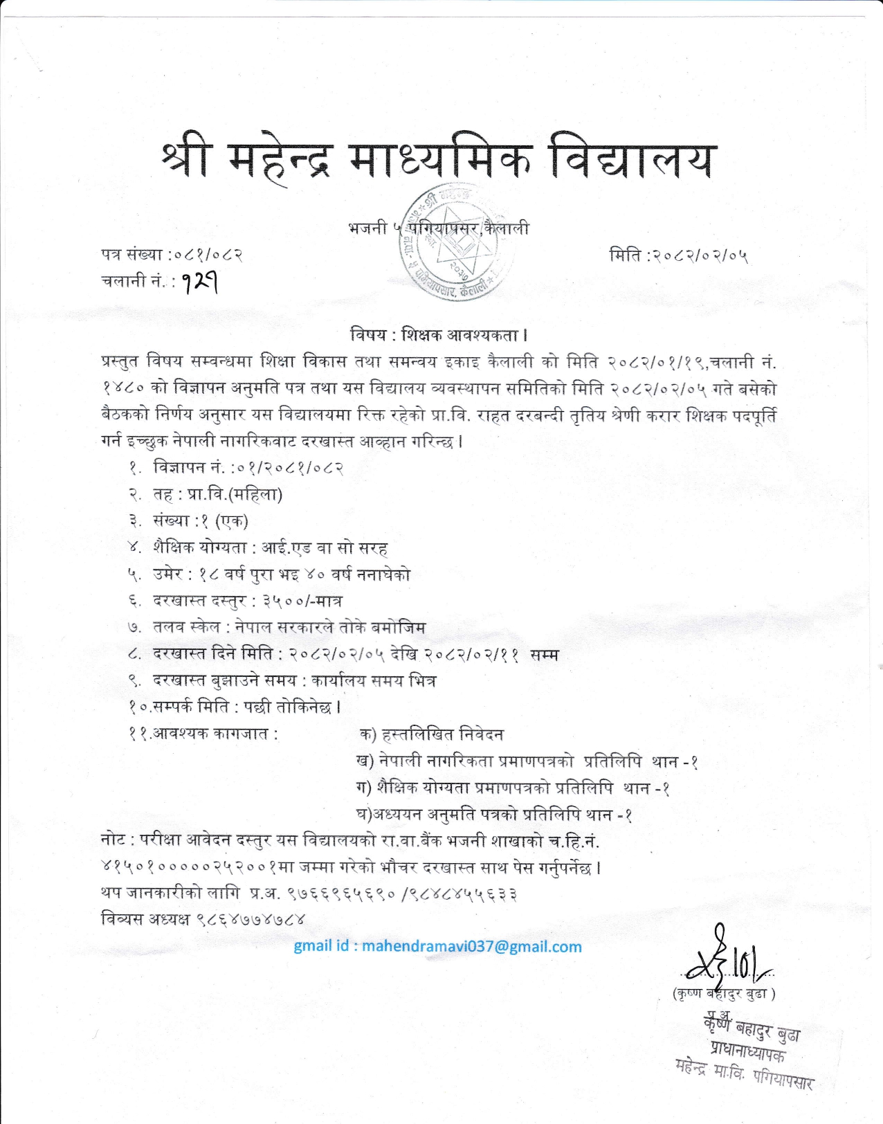 » महेन्द्र मा.वि.पगियापसारको शिक्षक आवश्यकता सम्बन्धी सूचना ।