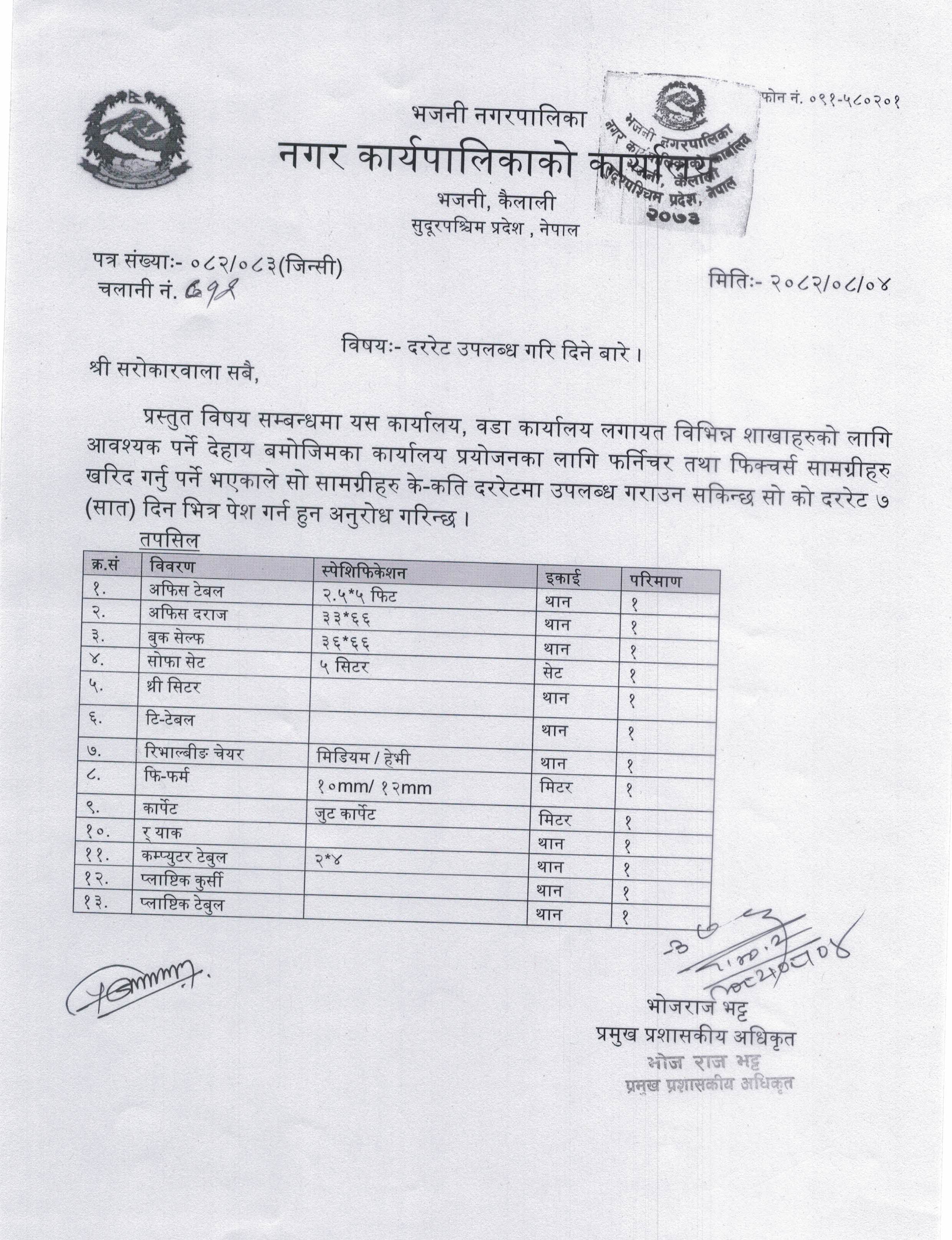 साईन बोर्ई छपाई लेखाईको दररेट उपलब्ध गरि दिने बारे ।