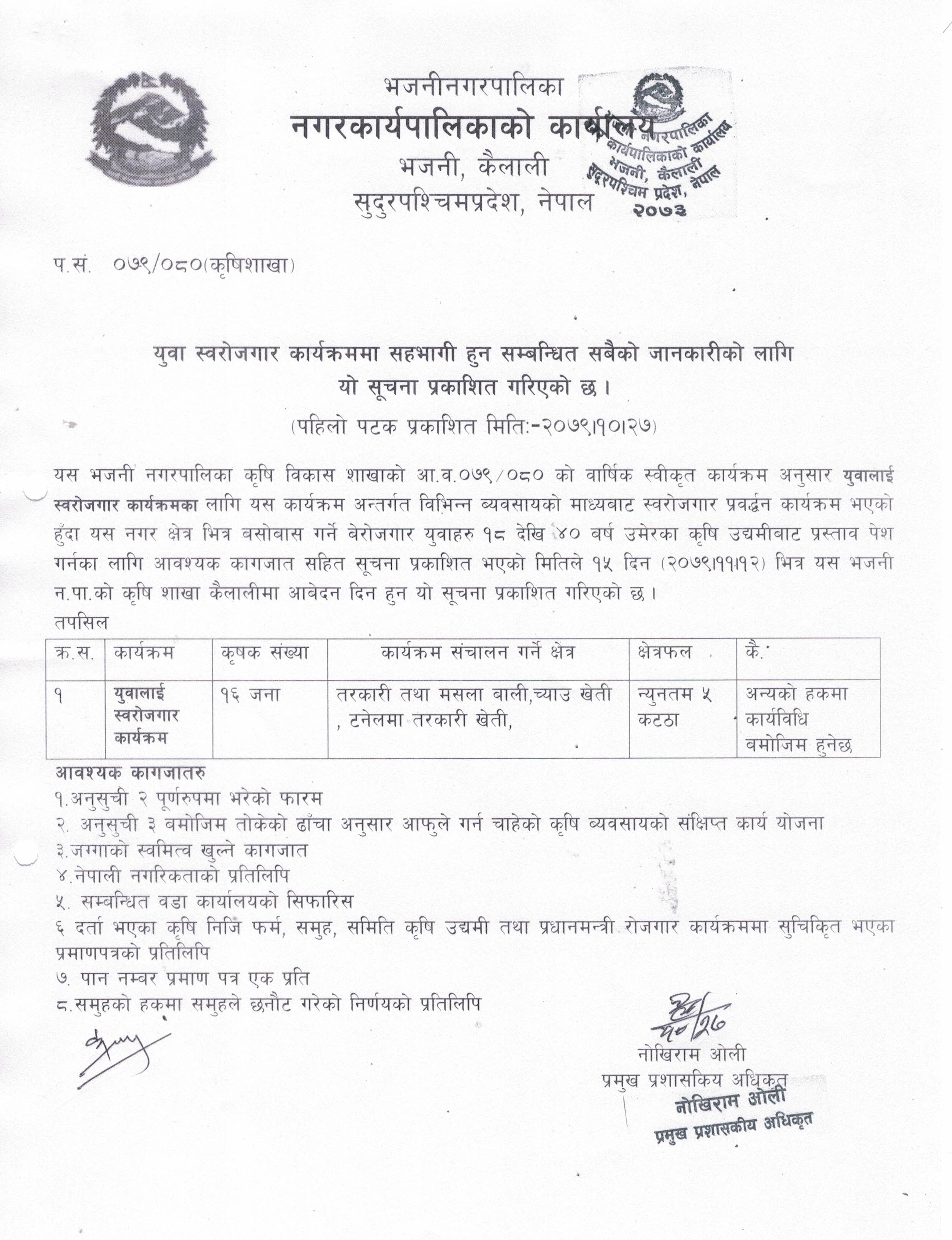 युवा स्वरोजगार कार्यक्रम सहभागी हुन आवेदन पेश गर्ने सम्बन्धी सूचना ।