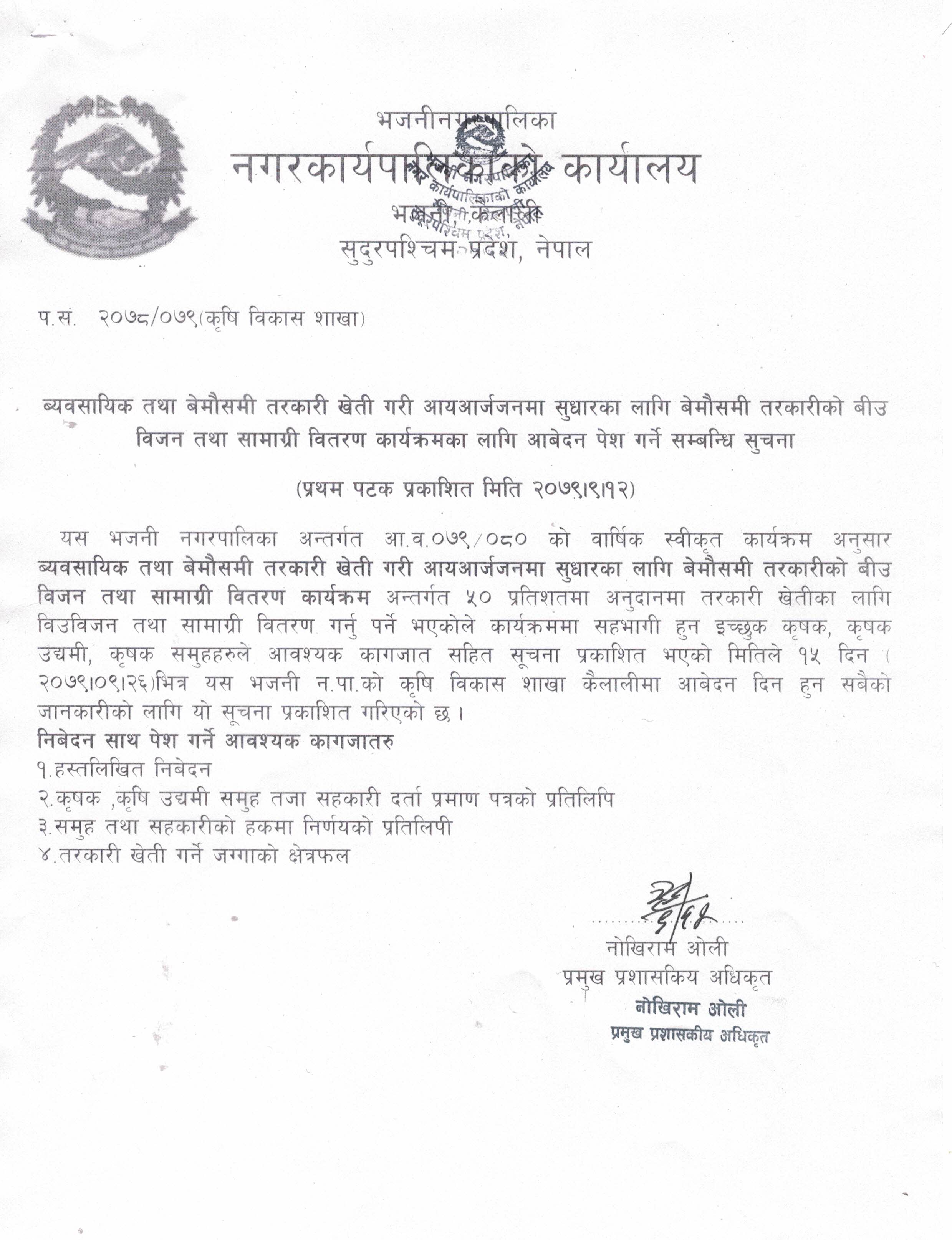 व्यवसायिक तथा बेमौसमी तरकारी खेती गरी आयआर्जनमा सुधारका लागि बेमौसमी तरकारीको बीउ विजन तथा सामाग्री विचरण कार्यक्रमका लागि आबेदन पेश गर्ने सम्बन्धि सूचना ।(कृषि विकास शाखा)