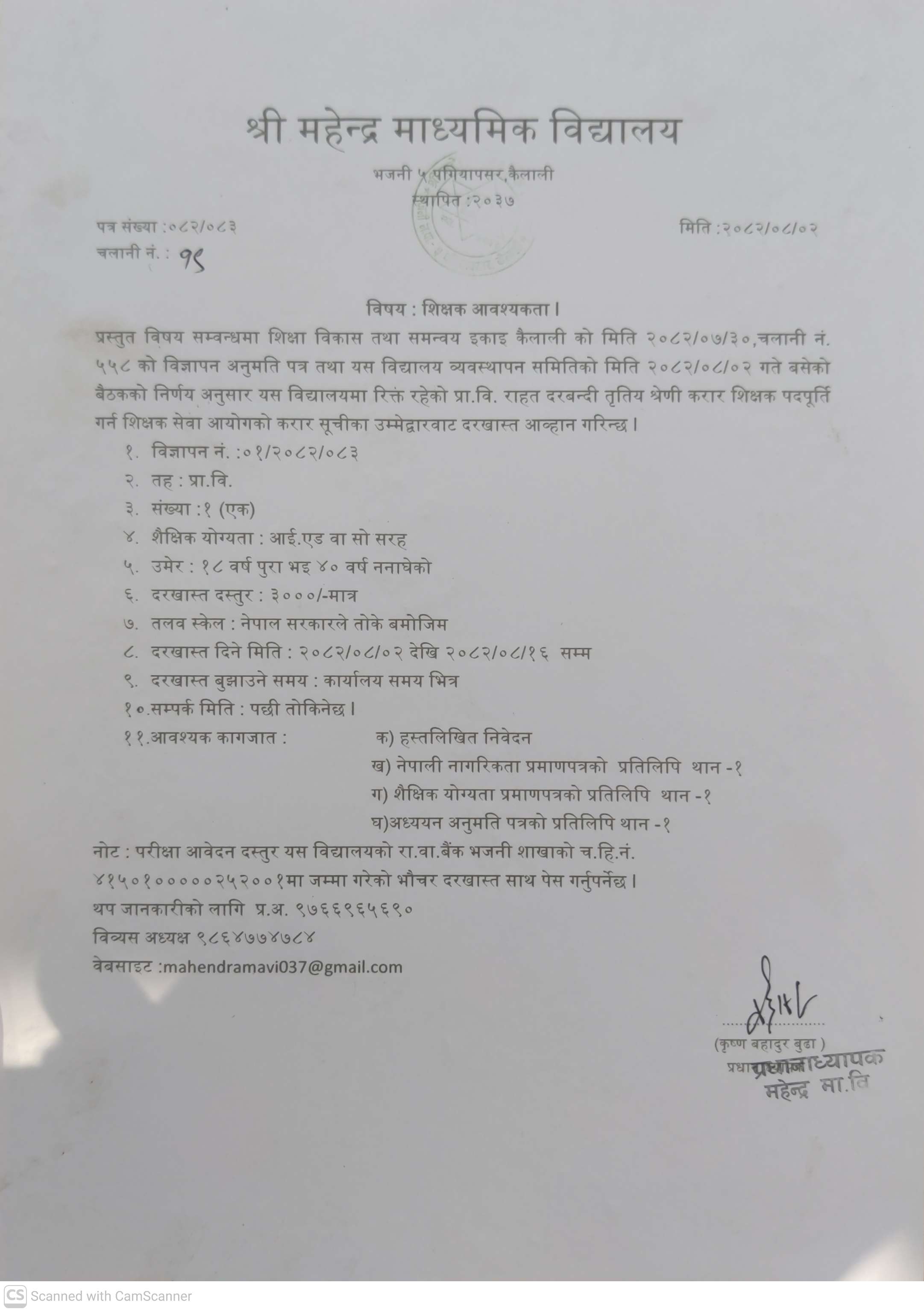 श्री महेन्द्र माध्यमिक विद्यालय, भजनी-५ पगियापसर, कैलालीको शिक्षक आवश्यकता सम्बन्धी सूचना ।