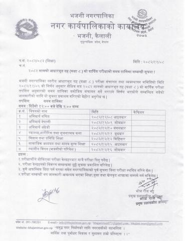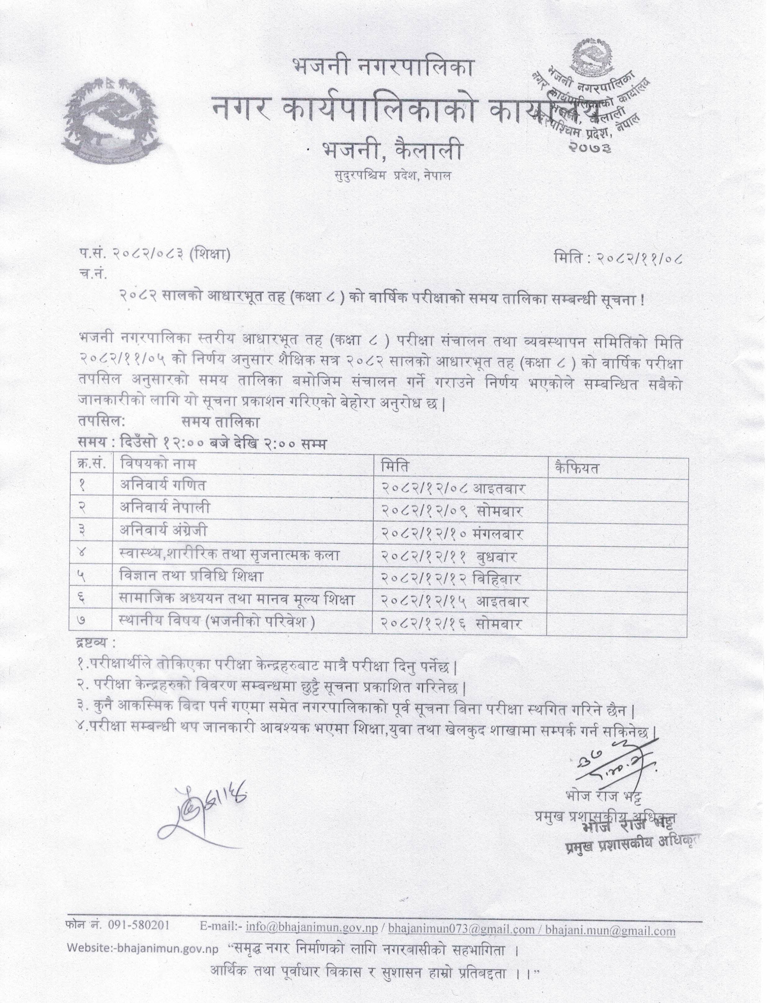 2082 सालको आधारभूत तह (कक्षा ८) को वार्षिक परीक्षाको समय तालिका सम्बन्धी सूचना ।